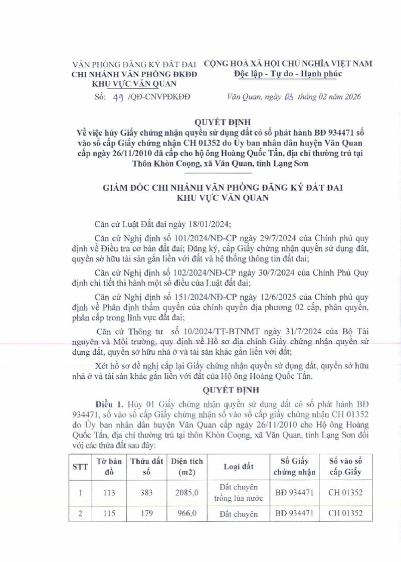 | Tiêu đề văn bản | Quyết định Về việc hủy Giấy chứng nhận quyền sử dụng đất số phát hành BD 934471, số vào sổ cấp Giấy chứng nhận CH 01352 do Ủy ban nhân dân huyện Văn Quan cấp ngày 26/11/2010 đã cấp cho hộ ông Hoàng Quốc Tuấn, địa chỉ đất tại thôn Khòn Cọong, xã Văn Quan, tỉnh Lạng Sơn | ||