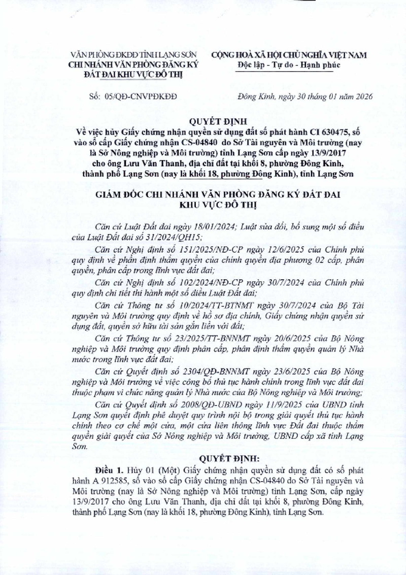 | Tiêu đề văn bản | Quyết định Về việc hủy Giấy chứng nhận quyền sử dụng đất số phát hành CI 630475, số vào sổ cấp Giấy chứng nhận CS-04840 do Sở Tài guyên và Môi trường (nay là Sở Nông nghiệp và Môi trường) tỉnh Lạng Sơn cấp ngày 13/9/2017 cho ông Lưu Văn Thanh, địa chỉ đất tại khối 8, phường Đông Kinh, thành phố Lạng Sơn (nay là khối 18, phường Đông Kinh), tỉnh Lạng Sơn | ||
