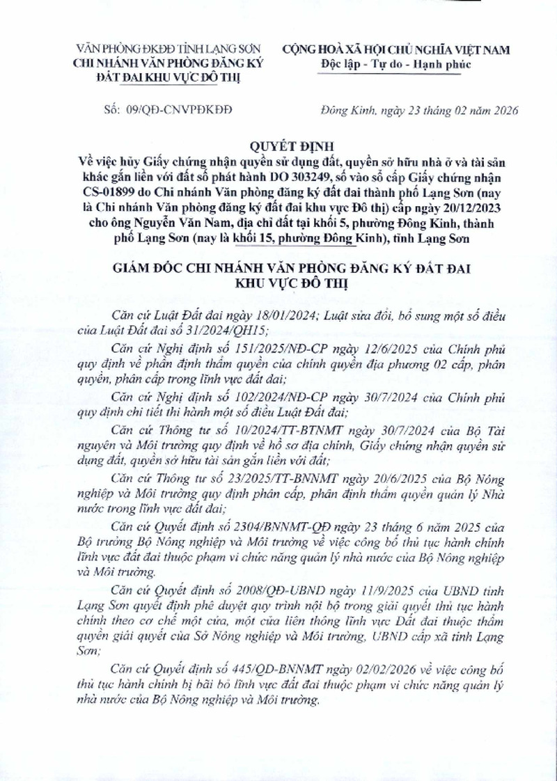 | Tiêu đề văn bản | Quyết định Về việc hủy Giấy chứng nhận quyền sử dụng đất, quyền sở hữu nhà ở và tài sản khác gắn liền với đất số phát hành DO 303249, số vào sổ cấp Giấy chứng nhận CS-01899 do Chi nhánh Văn phòng đăng ký đất đai thành phố Lạng Sơn (nay là Chi nhánh Văn phòng đăng ký đất đai khu vực Đô thị) cấp ngày 20/12/2023 cho ông Nguyễn Văn Nam, địa chỉ đất tại khối 5, phường Đông Kinh, thành phố Lạng Sơn (nay là khối 15, phường Đông Kinh), tỉnh Lạng Sơn | ||