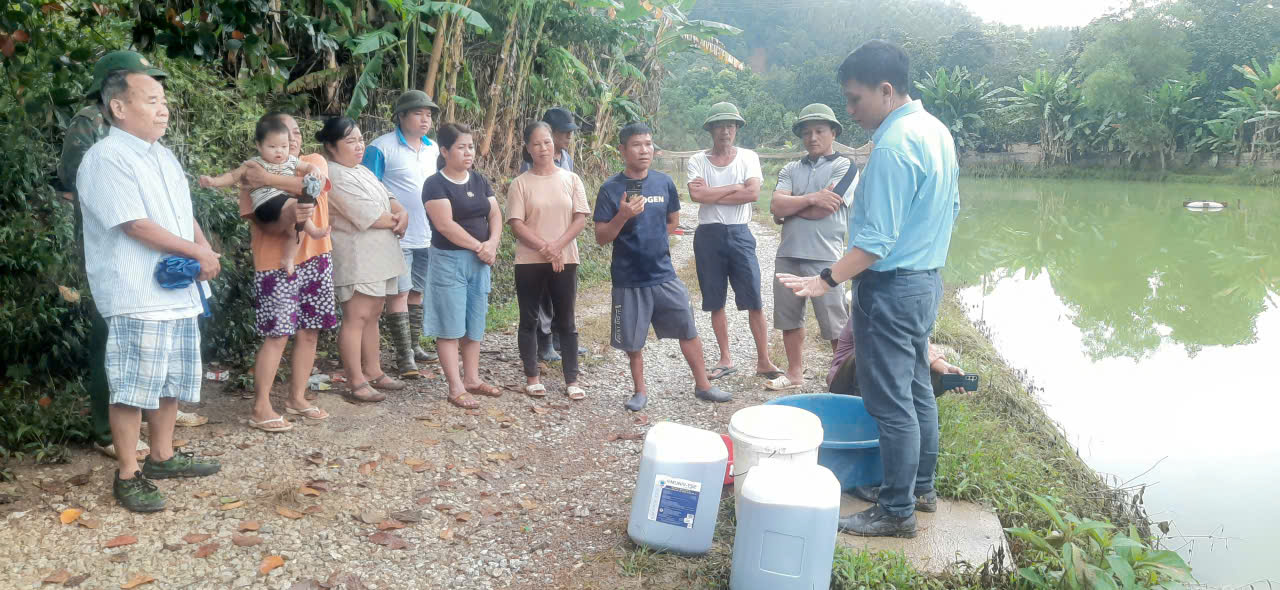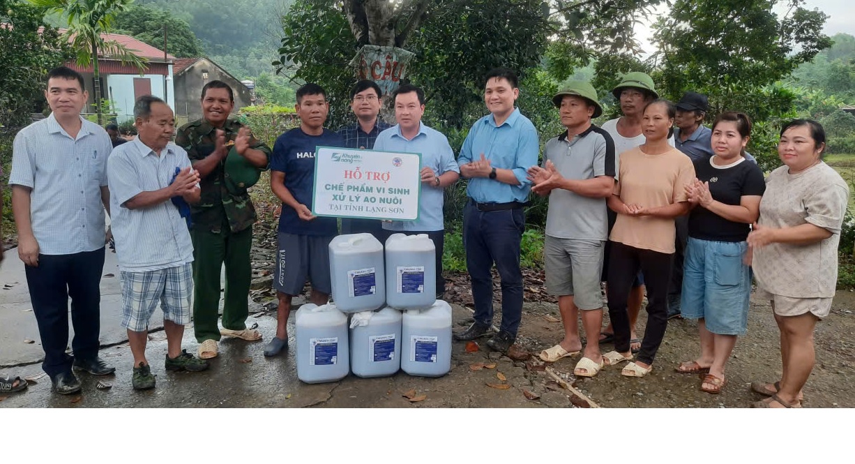 Trung tâm Khuyến nông Quốc gia, Trung tâm Khuyến nông tỉnh Lạng Sơn trao Chế phẩm vi sinh cho Nhân dân thôn Na Đâu, xã Hữu Lũng khôi phục sản xuất trong nuôi trồng thuỷ sản.