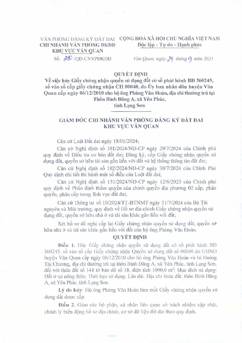 | Heading | Quyết định Về việc hủy Giấy chứng nhận quyền sử dụng đất có số phát hành BĐ 360245, số vào sổ cấp giấy chứng nhận CH 00040, do Ủy ban nhân dân huyện Văn Quan cấp ngày 06/12/2010 cho hộ ông Phùng Văn Hoàn, địa chỉ thường trú tại Thôn Bình Đãng A, xã Yên Phúc, tỉnh Lạng Sơn | ||
