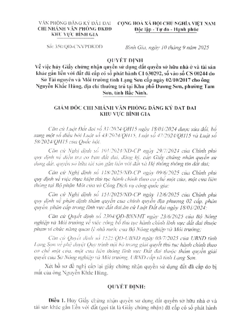 | Heading | Quyết định Về việc hủy Giấy chứng nhận quyền sử dụng đất quyền sở hữu nhà ở và tài sản khác gắn liền với đất đã cấp có số phát hành CI 630292, số vào sổ CS 00244 do Sở Tài nguyên và Môi trường cấp ngày 02/10/2017 cho ông Nguyễn Khắc Hùng, địa chỉ thường trú tại Khu phố Dương Sơn, phường Tam Sơn, tỉnh Bắc Ninh | ||