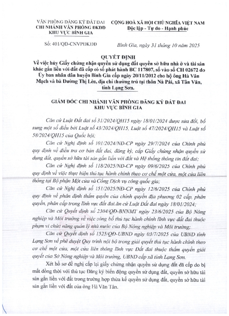 | Tiêu đề văn bản | Quyết định Về việc hủy Giấy chứng nhận quyền sử dụng đất quyền sở hữu nhà ở và tài sản khác gắn liền với đất đã cấp có số phát hành BC 117807, số vào sổ CH 02672 do Ủy ban nhân dân huyện Bình Gia cấp ngày 20/11/2012 cho hộ ông Hà Văn Mạch và bà Đường Thị Lèn, địa chỉ thường trú tại thôn Nà Pái, xã Tân Văn, tỉnh Lạng Sơn | ||
