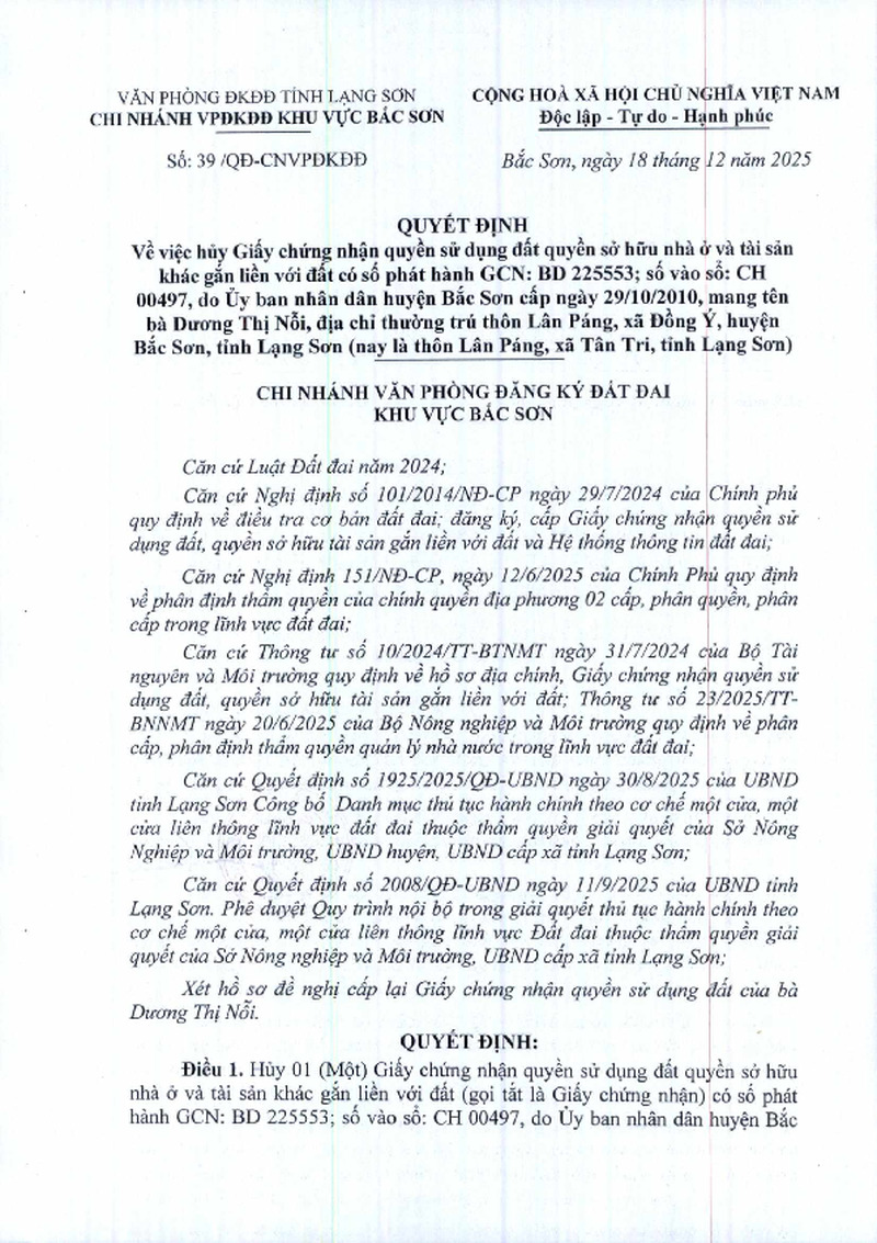 | Tiêu đề văn bản | Quyết định Về việc hủy Giấy chứng nhận quyền sử dụng đất, quyền sở hữu tài sản gắn liền với đất có số phát hành GCN: BD 225553; số vào sổ: CH 00497, do Ủy ban nhân dân huyện Bắc Sơn cấp ngày 29/10/2010, mang tên bà Dương Thị Nỗi, địa chỉ thường trú thôn Lân Páng, xã Đồng Ý, huyện Bắc Sơn, tỉnh Lạng Sơn (nay là thôn Lân Páng, xã Tân Tri, tỉnh Lạng Sơn) | ||