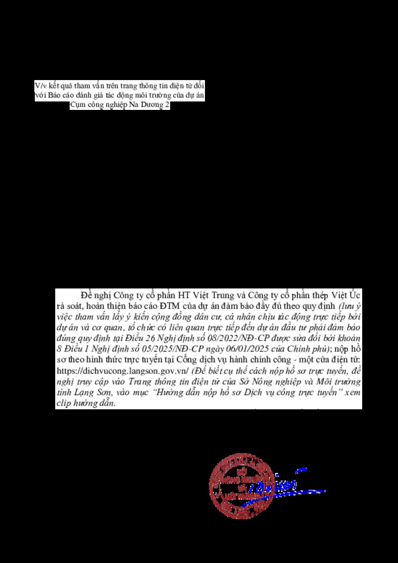 | Tiêu đề văn bản | Về việc kết quả tham vấn trên trang thông tin điện tử đối với Báo cáo đánh giá tác động môi trường của dự án Cụm công nghiệp Na Dương 2 | ||