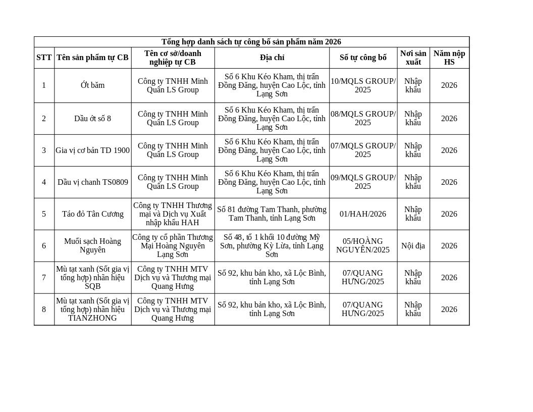 | Tiêu đề văn bản | Danh sách tự công bố sản phẩm năm 2026 (Tính đến ngày 19/01/2026) | ||