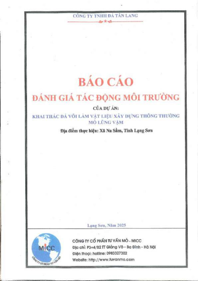 | Tên dự án | Báo cáo đánh giá tác động môi trường của dự án "Khai thác đá vôi làm vật liệu xây dựng thông thường mỏ Lũng Vặm" | |||||||||||||||