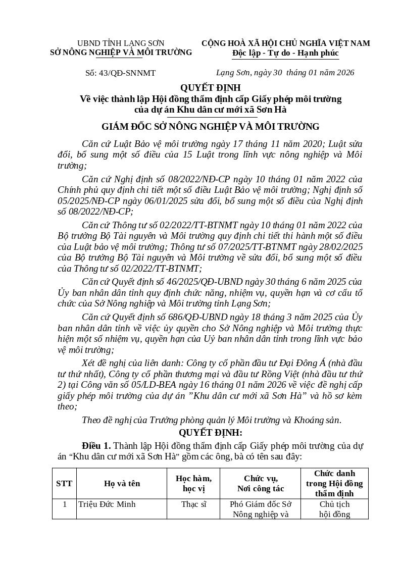 | Tiêu đề văn bản | Quyết định Về việc thành lập Hội đồng thẩm định cấp Giấy phép môi trường của dự án Khu dân cư mới xã Sơn Hà | ||