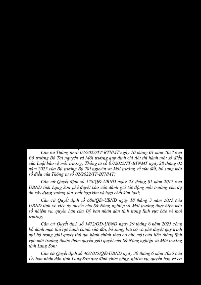 | Tiêu đề văn bản | Về việc giải quyết thủ tục hành chính hồ sơ đề nghị cấp giấy phép môi trường của cơ sở Xây dựng xưởng sản xuất hợp kim và hợp chất kim loại | ||