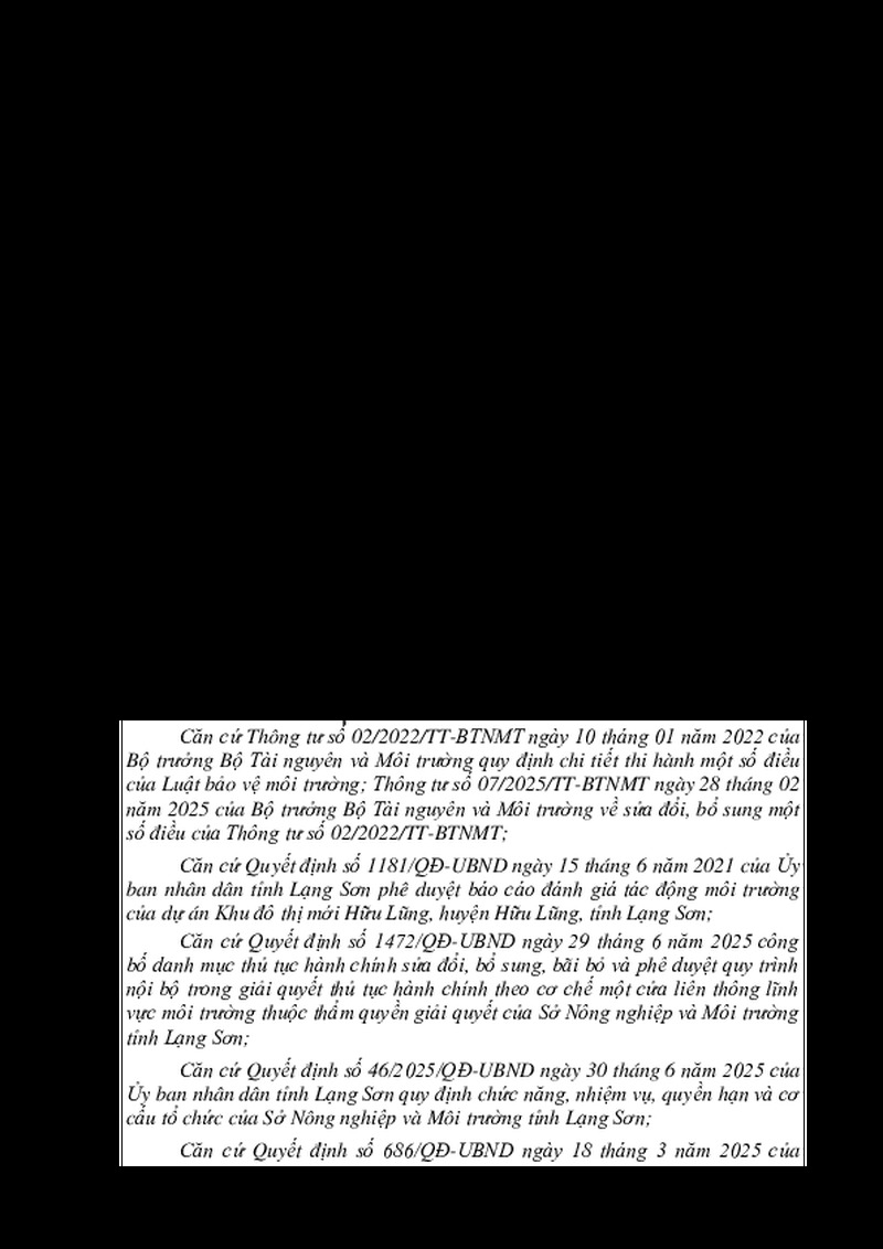 | Tiêu đề văn bản | Về việc giải quyết thủ tục hành chính hồ sơ đề nghị cấp Giấy phép môi trường Giai đoạn 1 dự án đầu tư Khu đô thị mới Hữu Lũng, huyện Hữu Lũng (nay là xã Hữu Lũng), tỉnh Lạng Sơn | ||